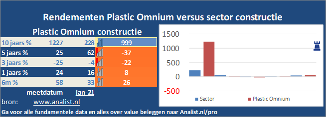 Sinds begin dit jaar staat het aandeel Plastic Omnium 10 procent lager. De afgelopen 5 jaren waren beroerde jaren voor beleggers. 95 procent won de internationale bouwmaterialensector sinds 2010. Gemeten vanaf 2015 staat de sector 33 procent hoger en over de voorbije 12 maanden (augustus 2019 - augustus 2020) is er een min van 3 procent. Het aandeel is zodoende een microcap.