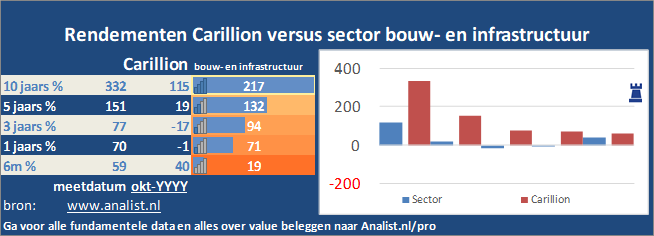 Over de afgelopen 5 jaar maakte het aandeel een forse koersdaling. De internationale bouw- en infrastructuursector staat sinds 2010 88 procent in de plus. Sinds 2015 staat de sector 18 procent hoger en over het voorbije jaar (augustus 2019 - augustus 2020) staat Carillion's peergroup op 3 procent verlies. Eind 2019 had het bouw- en infrabedrijf ruim 0 miljoen aandelen uitstaan.