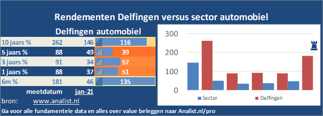 De afgelopen 5 jaren waren voor beleggers winstgevend. De afgelopen 10 jaar won de (internationale) automobiel zo'n 120 procent. Sinds 2015 staat de sector 3 procent hoger en over het voorbije jaar (augustus 2019 - augustus 2020) staat Delfingen's peergroup op 2 procent verlies. Zodoende is het aandeel een microcap.