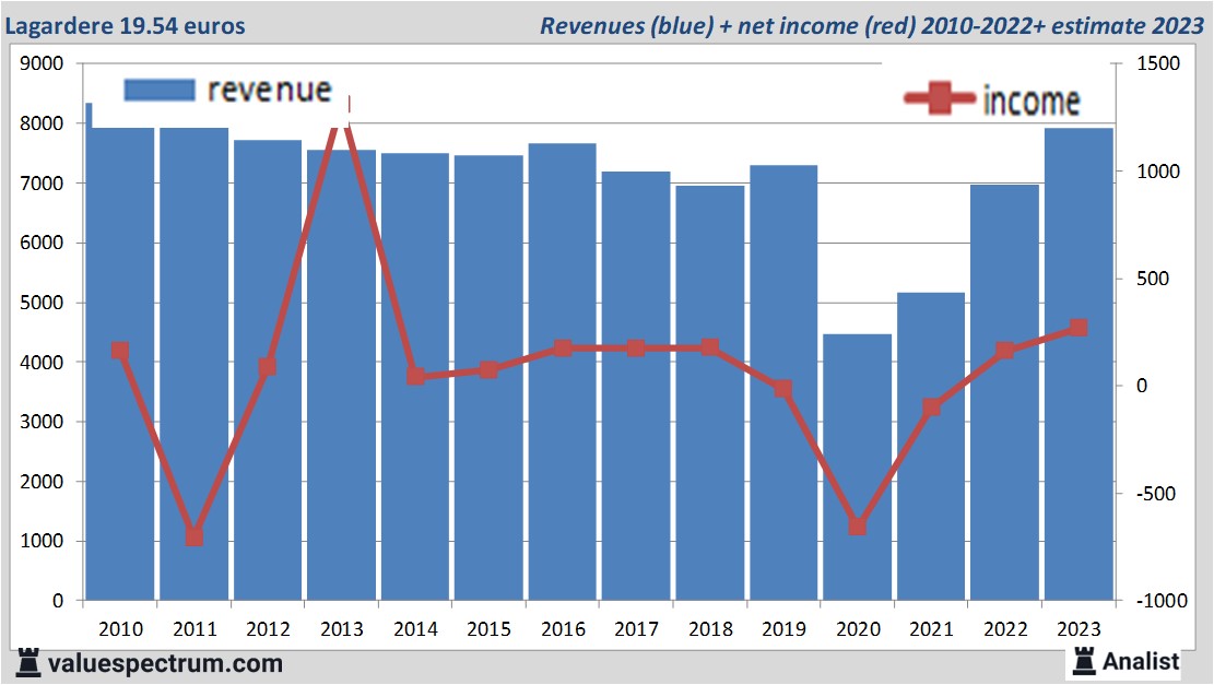 Beleggers in het aandeel Lagardere kunnen rekenen op een forse dividenduitkering. Gezien het gemiddelde van de analistentaxaties heeft het aandeel Lagardere nu één van de hoogste dividendrendementen van de Franse beurs. Per aandeel verwachten de analisten een dividend van 1.3 euro. Lagardere 's dividendrendement ligt dus op 6.65 procent. Het gemiddelde dividend van de televisie- & radiobedrijven ligt op een prima 7.05 procent.