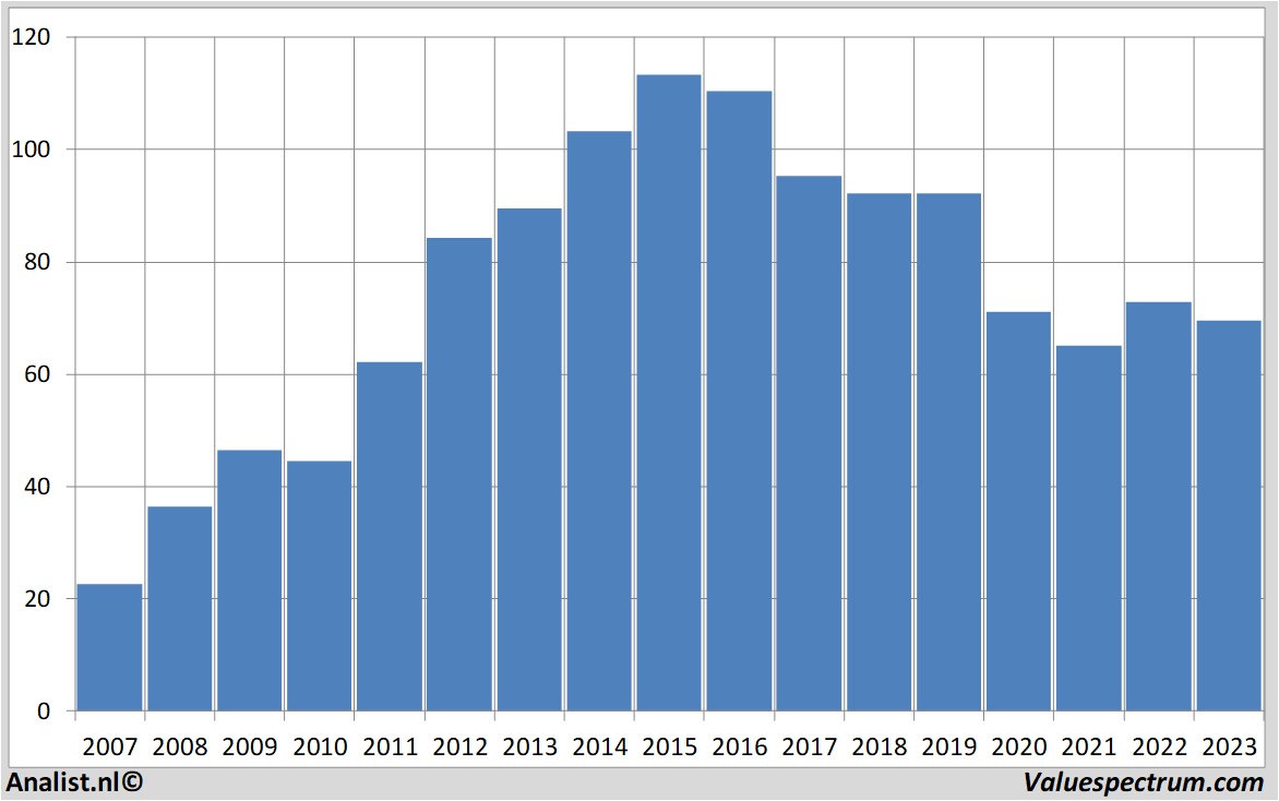 De analisten rekenen voor 2023 op een nettowinst van 1.73 miljard euro. Voor dit jaar ligt de consensus van het resultaat per aandeel op een winst van 4.36 euro. Op basis hiervan komt de koerswinstverhouding uit op 15.95.