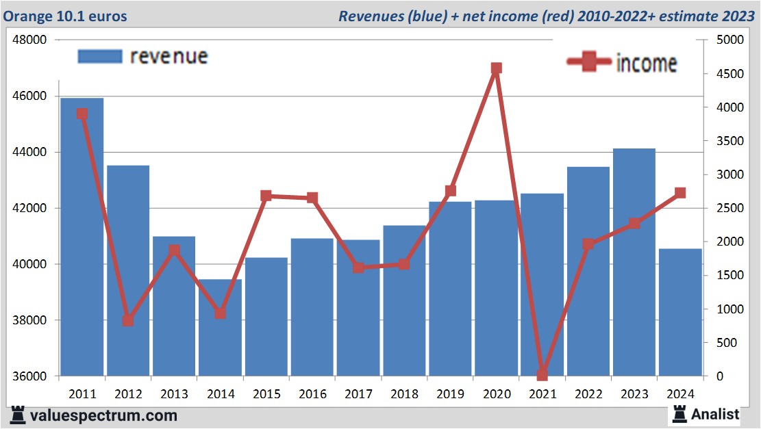 Houders van het aandeel Orange kunnen rekenen op een behoorlijke dividenduitkering. Kijkende naar de meeste analistenmeningen noteert het aandeel Orange nu één van de hoogste dividendrendementen van de Franse beurs. Per aandeel anticiperen de analisten op een dividendvergoeding van 75 cent. Het aandeel's dividendrendement komt dus op 7.43 procent uit. Het doorsnee dividendrendement van de vaste lijn com. sector ligt op een zeker aantrekkelijke 5.03 procent.