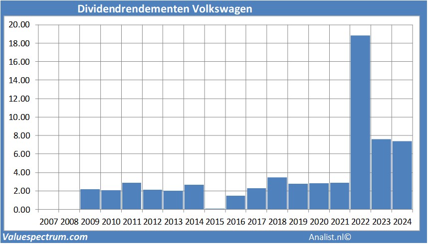Beleggers in het aandeel Volkswagen kunnen(op basis van de taxaties) rekenen op een aanzienlijke dividenduitkering. Kijkende naar de inschattingen door analisten heeft het aandeel Volkswagen nu één van de hoogste dividendrendementen van de Duitse beurs. Over dit jaar ligt de taxatie van de dividendvergoeding op 7.11 euro. Volkswagen 's dividendrendement bedraagt dus 7.4 procent. Gemiddeld levert een aandeel in de automobielproducenten levert een relatief aantrekkelijk dividendrendement van circa 4.58 procent op.