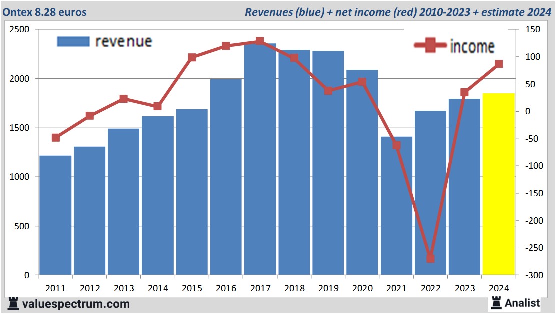 Wat betreft het resultaat rekenen De meeste analisten op een nettowinst van 86 miljoen euro. Over dit jaar ligt de consensus van Ontex 's resultaat per aandeel op een winst van 1.03 euro. Zodoende komt de koerswinstverhouding op 8.04 uit.