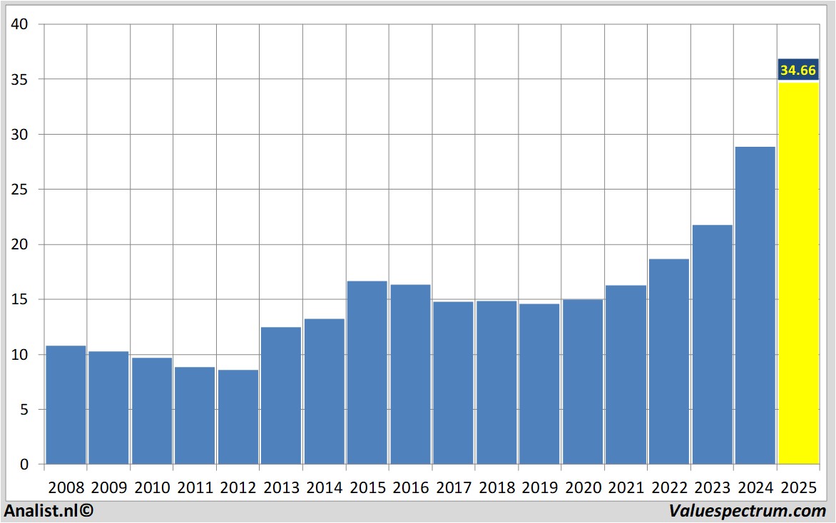 Onderaan de streep rekenen de meeste analisten op een nettowinst van 9.28 miljard euro. Over dit jaar wordt door het gros van de analisten een winst per aandeel van 1.83 euro verwacht. De koers-winst-verhouding ligt hiermee op 18.94.