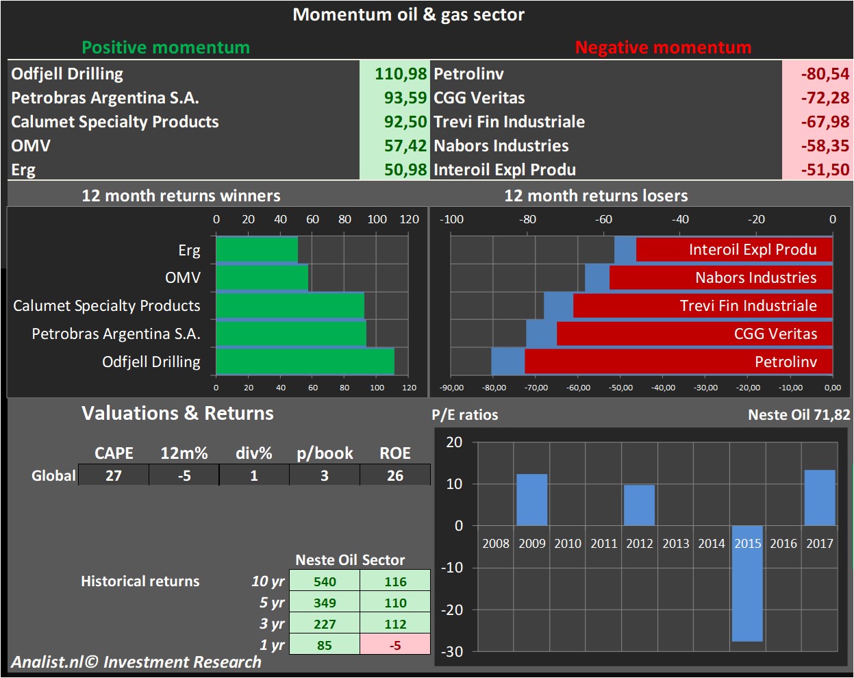 Het aandeel Neste Oil had de laatste jaren een sterk positief koersmomentum. Het aandeel was de afgelopen 1 jaar met een rendement van 85 procent één van de grote outperformers van haar sector. Het gemiddelde aandeel uit de sector leverde de afgelopen 1 jaar een verlies op van 5 procent. Het gemiddelde aandeel uit de olie- en gassector leverde het afgelopen 1 jaar een verlies op van 5 procent. Overige goed presterende aandelen in de sector zijn onder andere Odfjell Drilling Petrobras Argentina S.A. en Calumet Specialty Products. Bij de sectorwinnaars zitten onder andere Petrolinv , CGG Veritas en Trevi Fin Industriale .