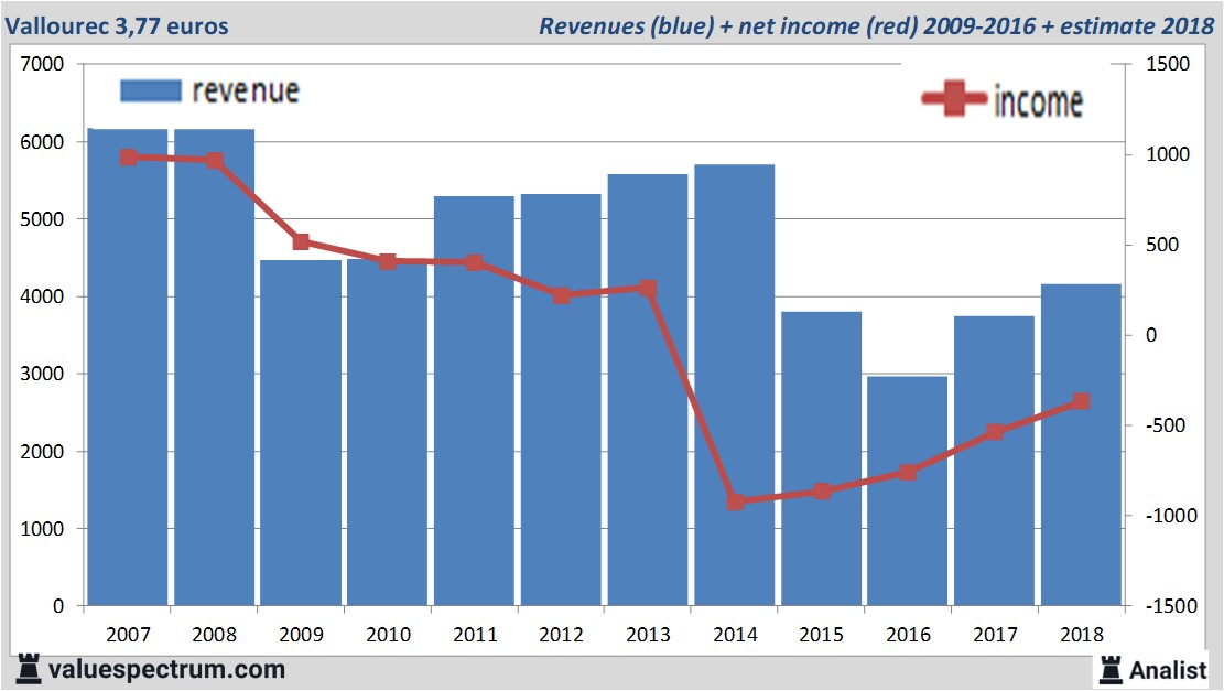 Morgen komt het Franse Vallourec haar resultaten over het afgelopen kwartaal. De omzet van Vallourec over dit jaar komt uit op 4,15 miljard euro. Zo blijkt uit gemiddelde analistenverwachting. Dit is fors meer dan de omzet over 2017 toen het concern 3,75 miljard euro verdiende.