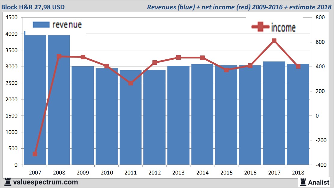 Block H&R zal morgen haar boeken over het afgelopen kwartaal aan de pers presenteren. Over het huidige boekjaar komt de omzet volgens de analisten uit op 3,08 miljard dollar. Dit is vrij beperkt minder dan de omzet over 2017 toen de omzet 3,16 miljard dollar bedroeg.