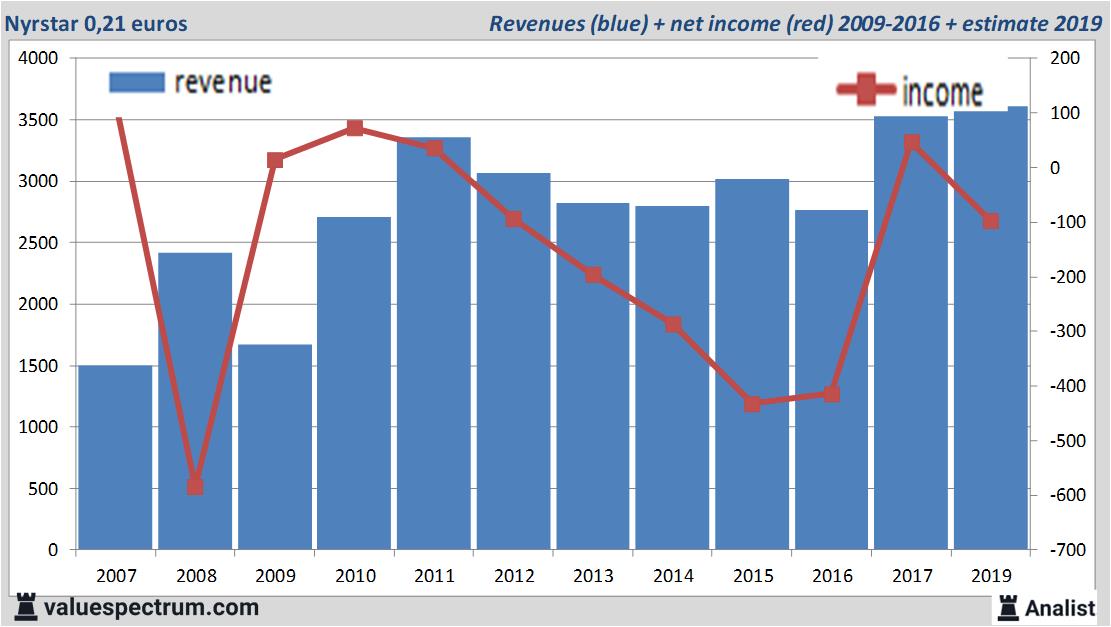 De meeste analisten gaan voor 2019 uit van een nettoverlies van 97 miljoen euro. Over dit jaar ligt de consensus van Nyrstar's resultaat per aandeel op een verlies van 1,16 euro. Op basis hiervan komt de koerswinstverhouding op -0,18 uit.