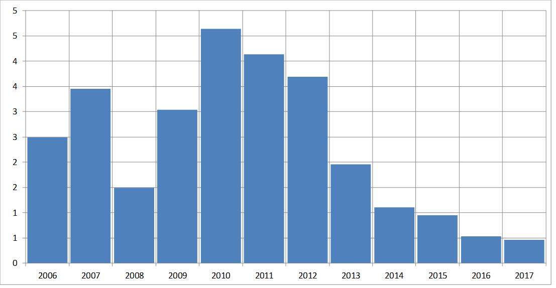 We zien dat het aandeel Saipem al jaren enorme verliezen leed. Beleggers die het aandeel 10 jaar terug zou hebben gekocht staat nu op een verlies van zelfs 84 procent. Dit in tegenstelling tot de oliesector die ruim 20 procent hoger noteert sinds begin 2007.