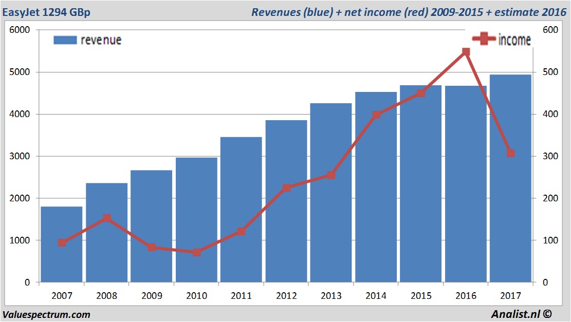 Morgen presenteert het Engelse bedrijf EasyJet haar resultaten over het afgelopen kwartaal. De gemiddelde verwachting van de omzet over dit jaar ligt volgens de analisten op 4,94 miljard GBp. De omzet zou volgens de analisten dit jaar dan het hoogste in haar bestaan zijn. Dit is licht meer dan de omzet over 2016 toen het bedrijf 4,69 miljard GBp verdiende.