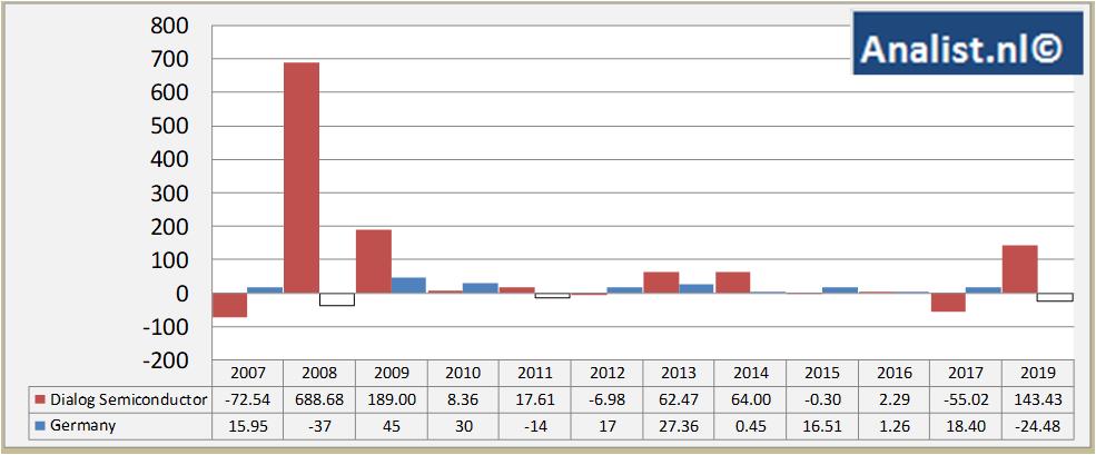 Van Dialog Semiconductor worden over dit jaar geen dividenduitkeringen verwacht. Het gemiddelde dividendrendement van de halfgeleiders sector ligt op een magere 1 procent.