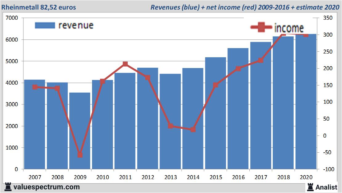 Maandag presenteert Rheinmetall haar prestaties over het afgelopen kwartaal. Over het huidige boekjaar komt de omzet volgens de analisten uit op 6,26 miljard euro. Dit is vrij beperkt meer dan de omzet over 2018 toen het concern 6,15 miljard euro verdiende.