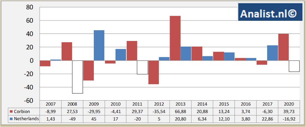 Beleggers die het aandeel in 2007 aanschaften staan nu op een forse winst van 73 procent. Het aandeel staat sinds 2012 op een winst van 86 procent. Over de voorbije 3 maanden staat het aandeel op een winst van 15 procent.Morgen zal het Nederlandse Corbion met haar resultaten over het afgelopen kwartaal komen. Over 2020 komt de omzet volgens de gepolste analisten uit op 1,01 miljard euro. Dit is behoorlijk minder dan de omzet over 2019 toen het bedrijf 976,4 miljoen euro verdiende.