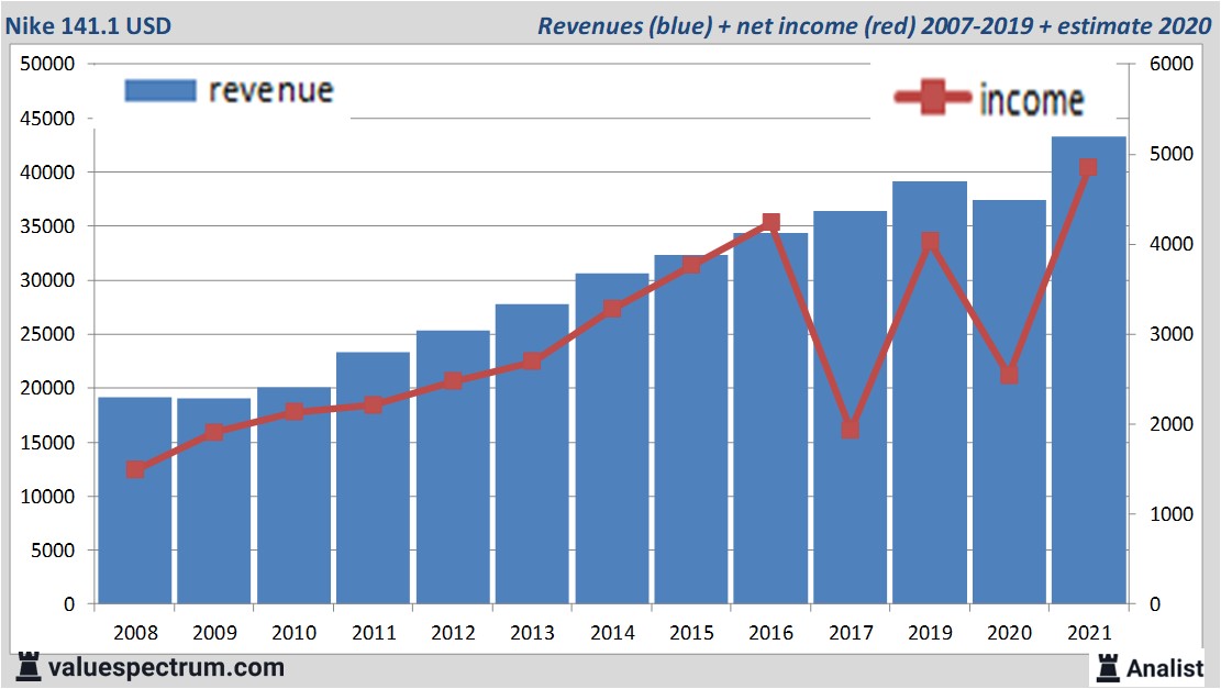 Morgen presenteert het Amerikaanse Nike haar resultaten over het afgelopen kwartaal. Over het lopende jaar ligt de consensus van de omzet van het bedrijf uit Beaverton op 43.34 miljard dollar. Dit is behoorlijk meer dan de omzet over 2020 toen het concern 37.4 miljard dollar verdiende.