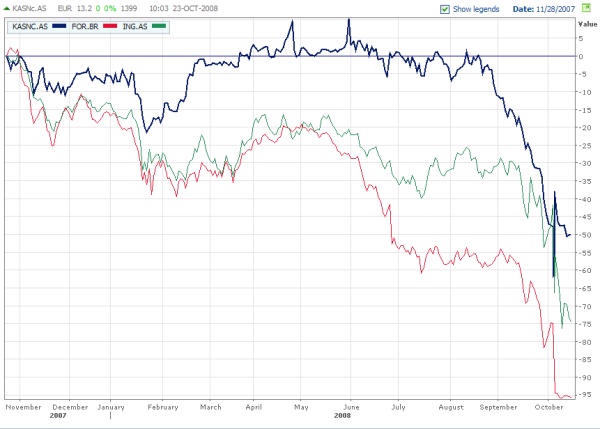 Ageas (rood) en ING (groen). Te zien is dat KAS BANK als één van de weinige financials in het afgelopen jaar een periode heeft gehad waarin het een positief rendement liet zien. Het aandeel is echter in de afgelopen 2 maanden in een vrije val geraakt. KAS BANK noteerde een even hoog negatief rendement als ING vóórdat de problemen bij deze financial ontstonden. Op dit moment heeft het aandeel KAS BANK een negatief rendement van 50%. Dit is minder slecht dan ING en