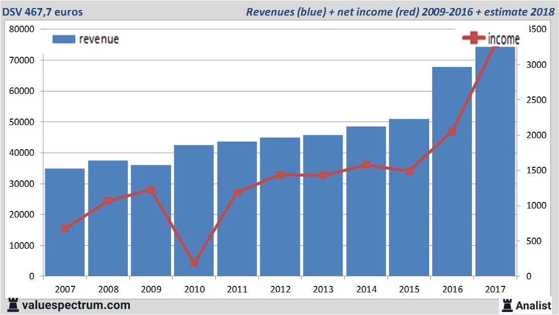 Morgen komt het Deense DSV met haar resultaten over het voorbije kwartaal. Over dit jaar komt de omzet volgens de analisten uit op 74,24 miljard euro. Dit is licht meer dan de omzet over 2016 toen de omzet 67,75 miljard euro bedroeg.