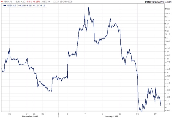 Aegon over de afgelopen maand (19-12-2008 tot 19-01-2009). De grafiek laat duidelijk zien dat de koers van het aandeel over de afgelopen maand behoorlijk volatiel is geweest. Op 19 december stond het aandeel op 4,65 euro. Vervolgens bereikte de koers op 31 december zijn tot dan toe dieptepunt op 4,33 euro. Vanaf het begin van het nieuwe jaar maakte het aandeel diverse spurten omhoog tot 5,55 euro op 7 januari. Vervolgens is het aandeel weer keihard gedaald tot een dieptepunt van bijna 4 euro op 15 januari. Momenteel ligt de koers op ongeveer 4,12 euro.