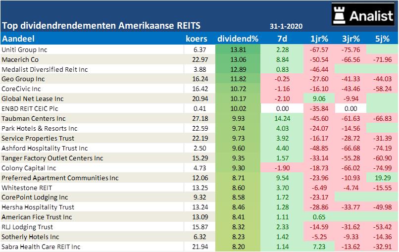 in de tabel hier boven (bron Analist Pro) ziet u een overzicht van de momenteel hoogste dividendrendementen bij de Amerikaanse REITS. Dit lijken al gauw vallende messen gezien de extreem negatieve rendementen over de langere termijn. Zo noteren de meesten op 3- en 5-jaarsbasis op de helft van hun eerdere niveaus toen. Extreem hoge dividendrendementen kunnen ook een waarschuwingssignaal zijn zoals we eerder bij bijvoorbeeld KPN, KPN Qwest, Versatel, ING Groep, Ageas, Dexia, Enron etcetera zagen. Hoe lager de koersen hoe hoger de dividendrendementen. Vaak werden de dividenden verlaagd of ingetrokken zodat beleggers enorm op het verkeerde been stonden.